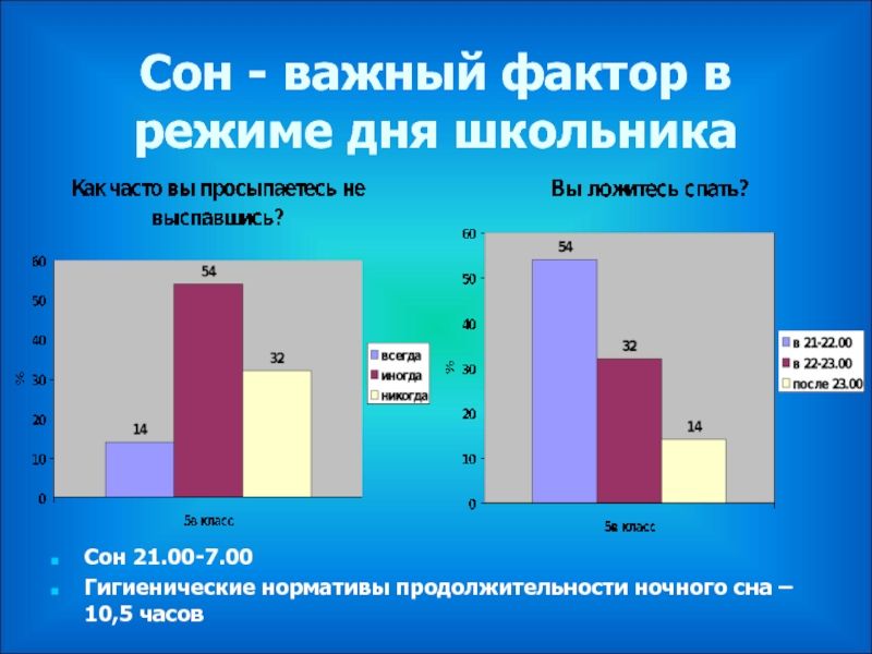 Сколько времени должен спать школьник? Потребности во сне меняются с возрастом: 1-4 класс – 10-10,5 часов; 5-7 класс – 10,5 часов; 8-9 класс – 9-9,5 часов; 10-11 класс – 8-9 часов; молодые люди (от 18 до 25 лет), как и взрослые, нуждаются в 7 - 9 часах полноценного сна.