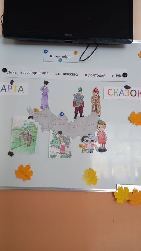 30 сентября- День воссоединения Донецкой народной республики, Луганской народной республики, Запорожской области, Херсонской области с Российской Федерацией. Об этой памятной дате шла речь на общешкольной линейке с учащимися первых- десятых классов МБОУ Выделянская СОШ. А с учащимися начальной школы советник директора по воспитательной работе Поляничко Э.И. организовала проведение мероприятия "Карта сказок". Его целью было : через народные сказки исторических территорий развить творческие способности учащихся и формировать чувство единства. В ходе интерактивного занятия ребята познакомились с народными сказками и создали карту с персонажами и символами произведений. Готовые карты сказок были размещены на школьном стенде в холле, что способствовало формированию интереса всех учащихся школы к культурному наследию исторических территорий.