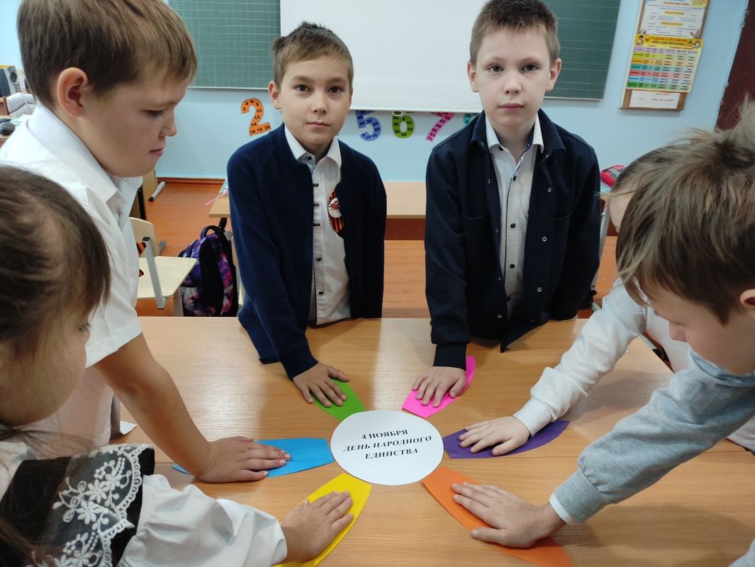 4 ноября вся Россия отмечает «День народного единства». Накануне праздника В 4 классе прошла беседа «Дружба народов – сила страны» посвященные этой дате. Дети вспомнили историю возникновения праздника, подвиги наших предков во имя независимости Родины.Также  ребята вспомнили о том, как велика и красива наша Родина, как богата событиями её история. Проведение таких мероприятий помогает воспитывать чувство любви к Родине, гордости за неё, за народ, населяющий Россию. Основная цель мероприятий, посвященных празднованию Дня народного единства — сформировать у детей уверенность в том, что Россия – великая многонациональная страна с героическим прошлым и счастливым будущем.