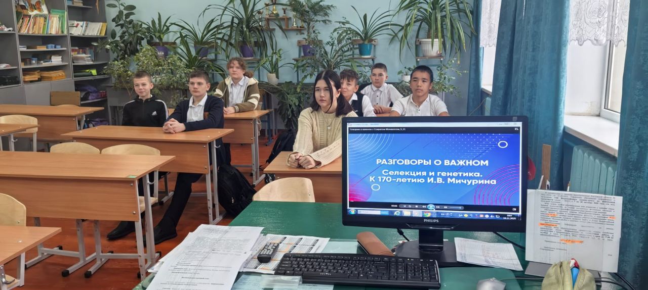 Утро понедельника 10 ноября началось традиционно с торжественной линейки, выноса флагов и звучания гимна Российской Федерации. Затем ребята отправились на занятия из цикла" Разговоры о важном". Тема сегодняшнего занятия " Селекция и генетика". Школьники отправились в увлекательное путешествие по современным лабораториям, где выводятся новые сорта овощей и фруктов. Ребята говорили о профессии учёных- селекционеров и о том, что благодаря их труду растения становятся крупнее вкуснее, полезнее. Занятие приурочено к 170-летию со дня рождения выдающегося российского ученого-селекционера Ивана Владимировича Мичурина. Беседа сопровождалась красочной презентацией, видеороликами и интерактивной викториной, в которой ребята старались определить предков современных растений.